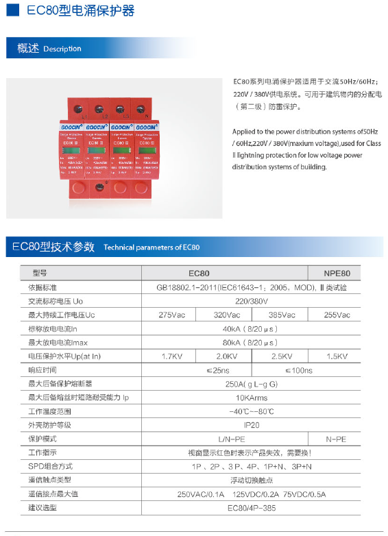 EC80系列电涌保护器适用于交流50HZ 60HZ; 220V 380V供电系统,可用于建筑物内的分配电(第二级)防雷保护。