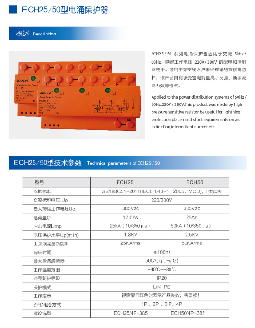 ECH25 50系列电涌保护器适用于交流50HZ 60HZ; 额定工作电压220V 380V的配电和控制系统中。可用于架空线入户未经衰减的直接雷防护,该产品具有承受雷电能量高、灭弧、断续流能力强等特点。